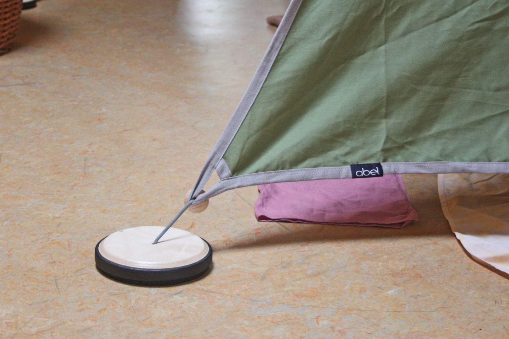 Uniek is dat de Abeltent verkrijgbaar is met gewichten of haringen. De gewichten zijn er g geschikt om de kindertent op te zetten in huis of op school. De kindervriendelijke haringen maken het mogelijk om de tent buiten op te zetten.